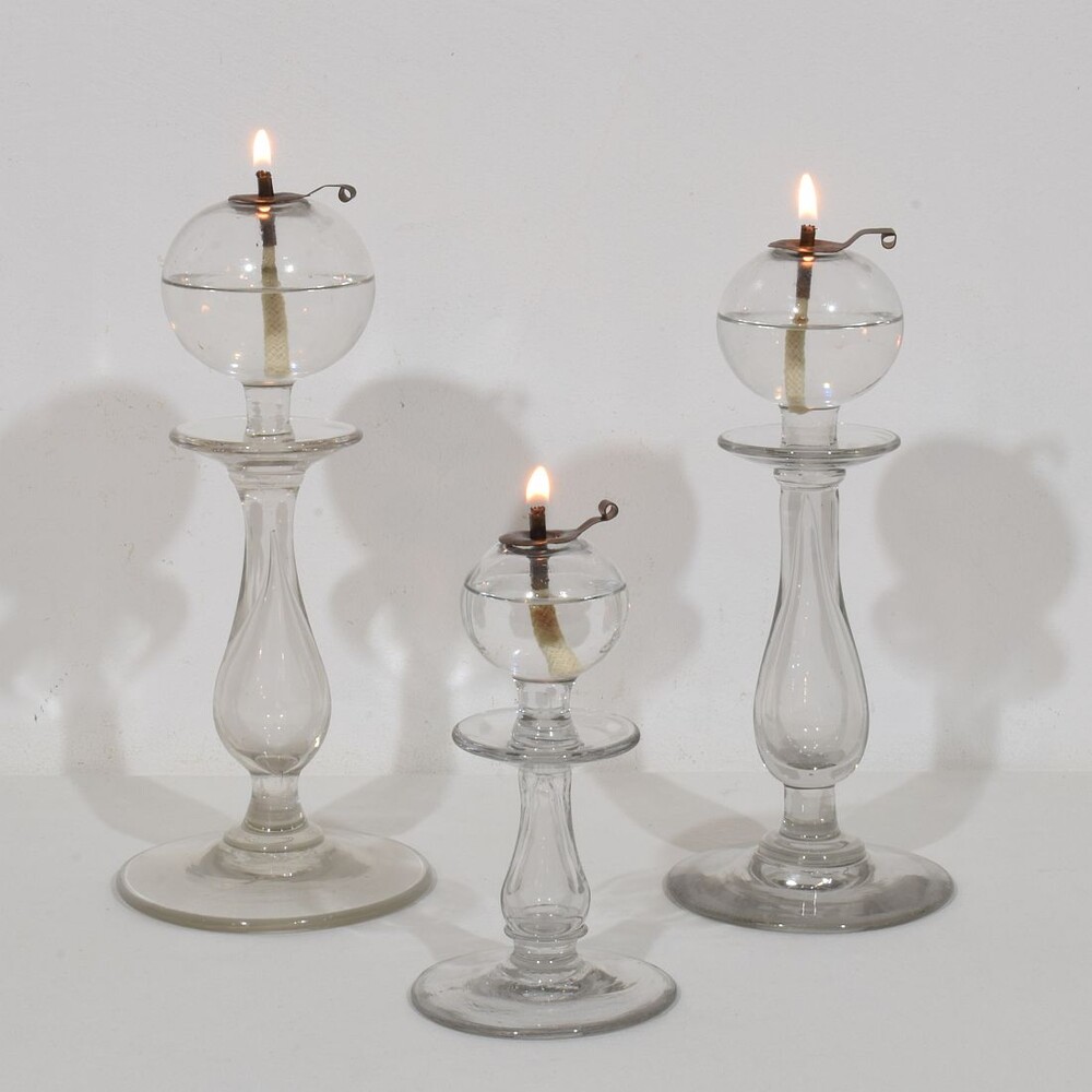 Rare collection of three hand blown glass weaver oil lamps from the South of France, France, circa 1800-1900