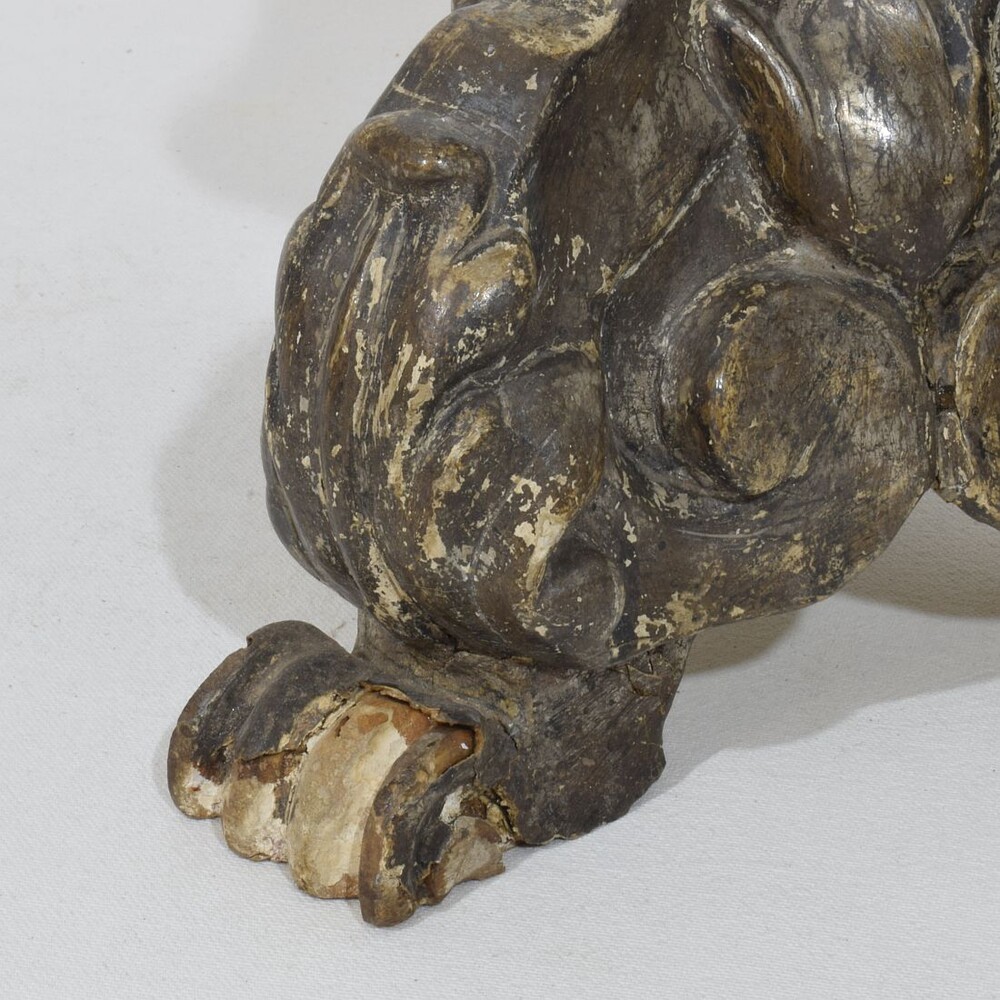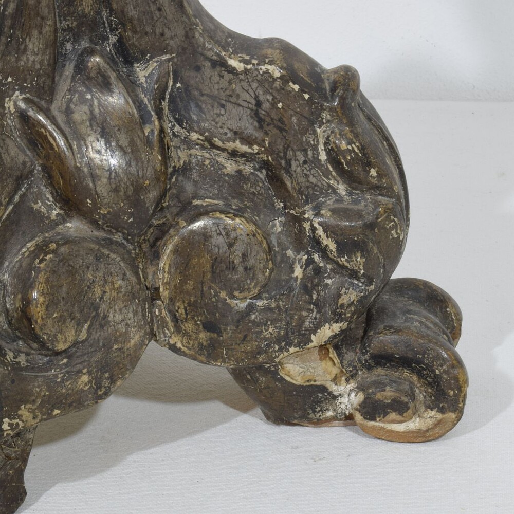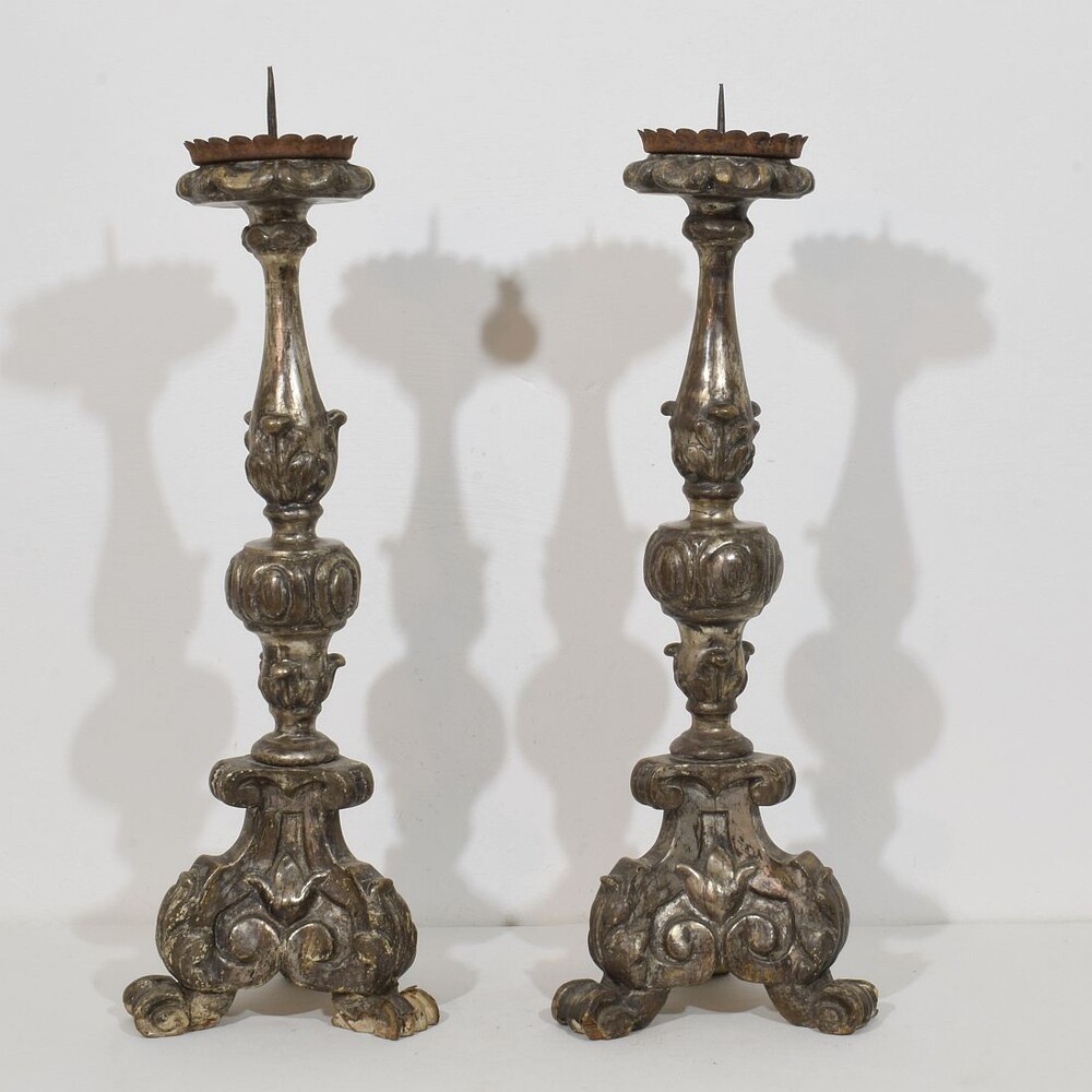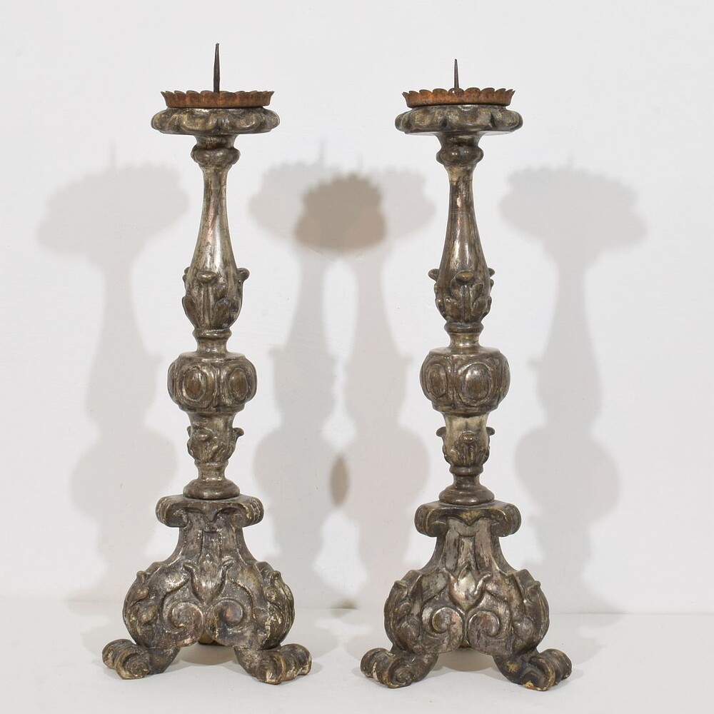Great pair of carved wooden candleholders with their beautiful weathered silver leaf gilding.