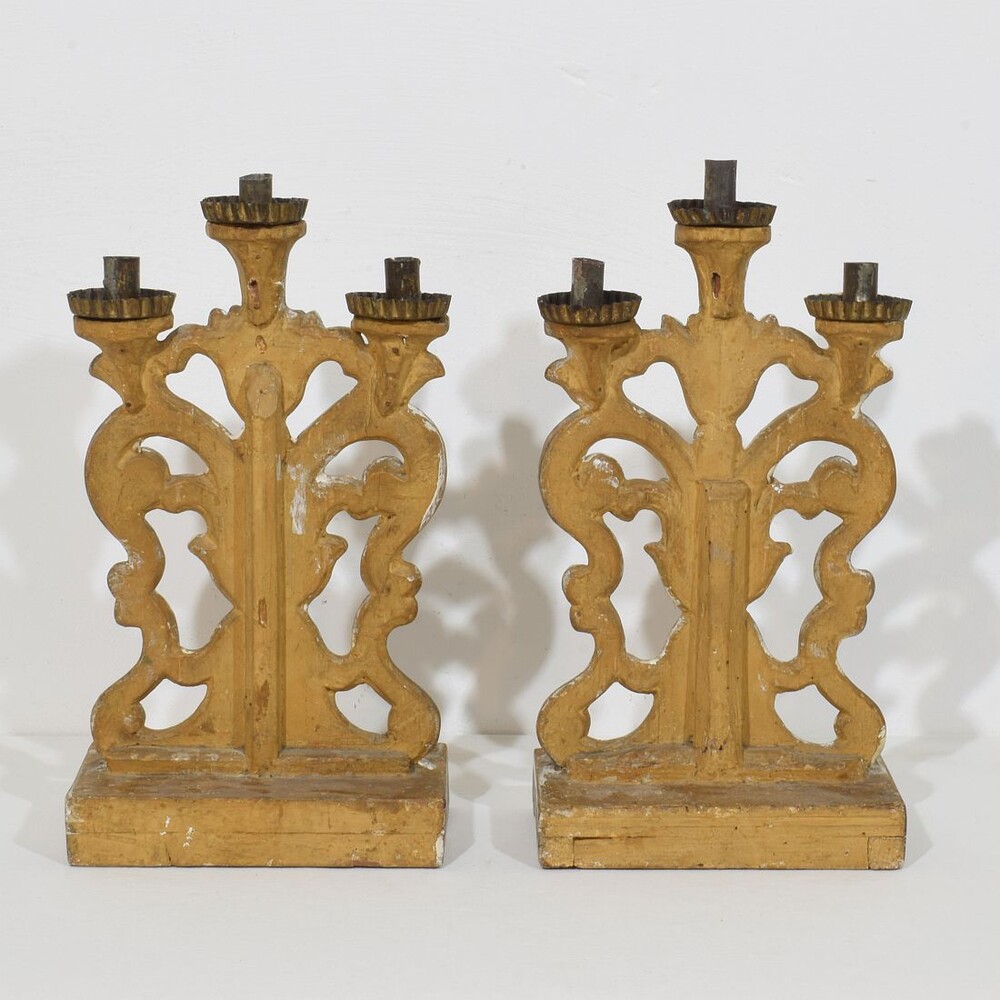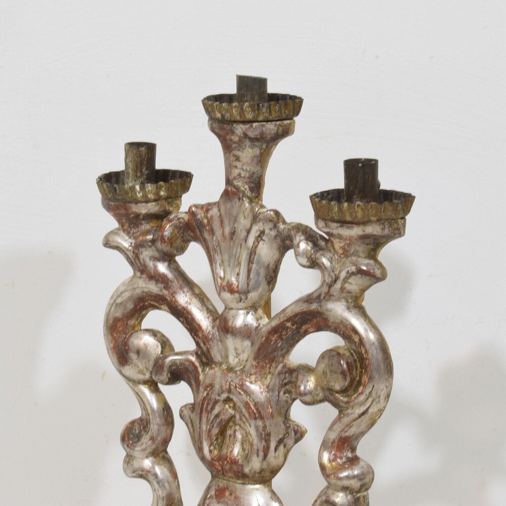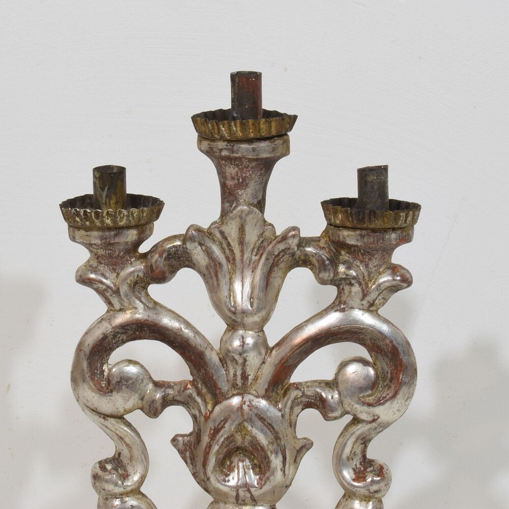 Unique Baroque silvered candleholders for in total 6 candles, Italy, circa 1750-1780. Weathered, repairs and losses.