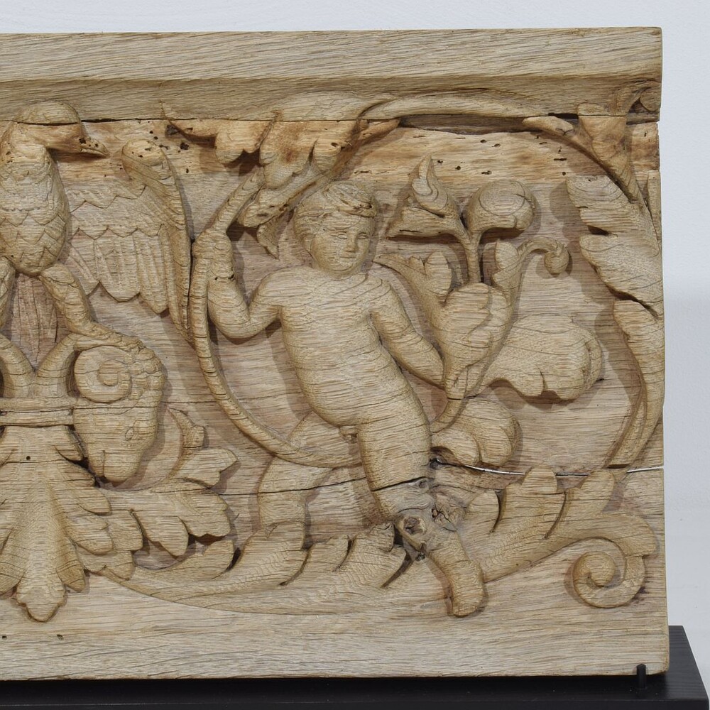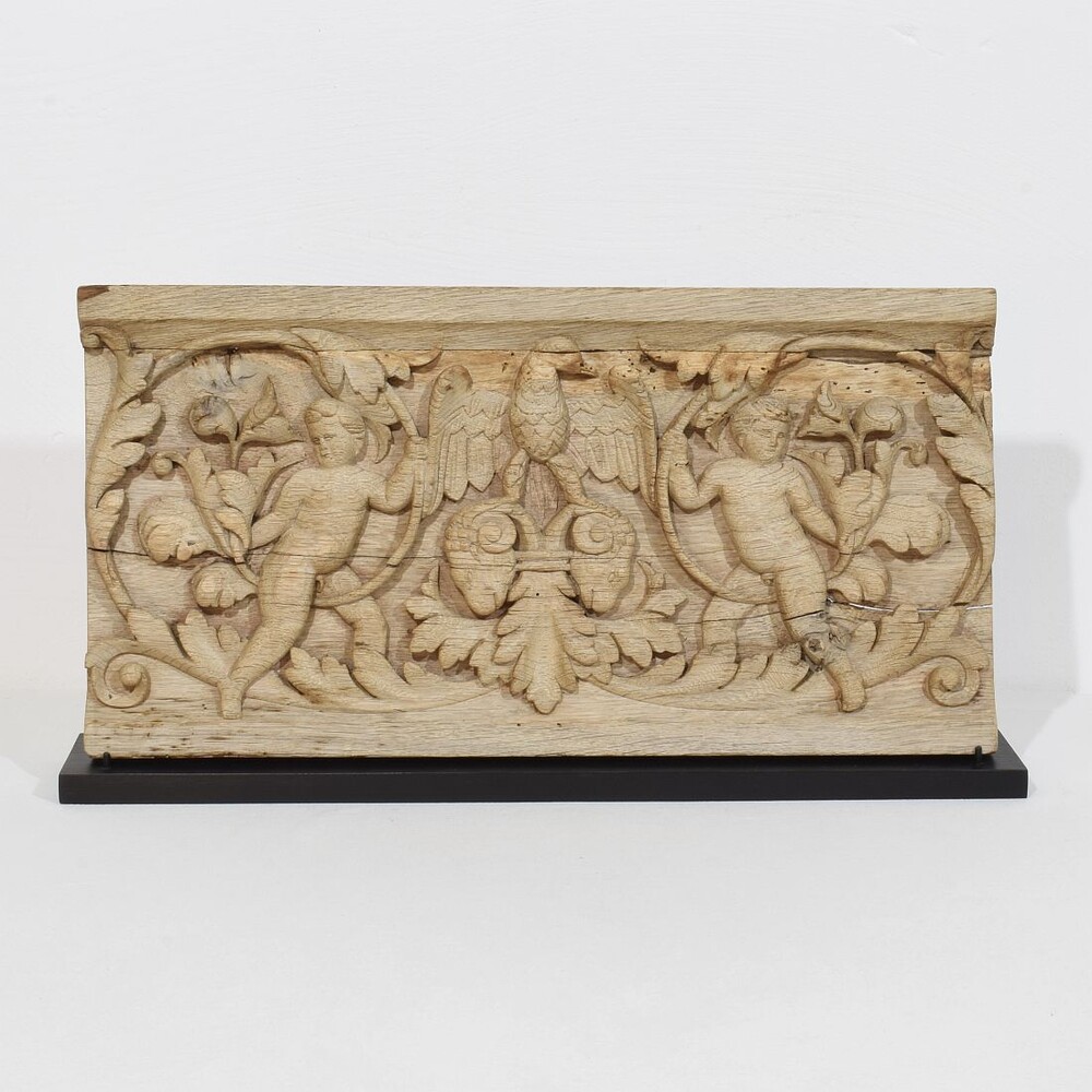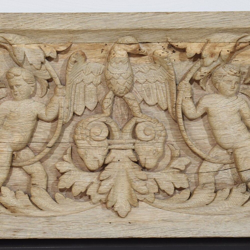 Beautiful weathered oak panel depicting two baroque angels and an eagle standing on rams heads .