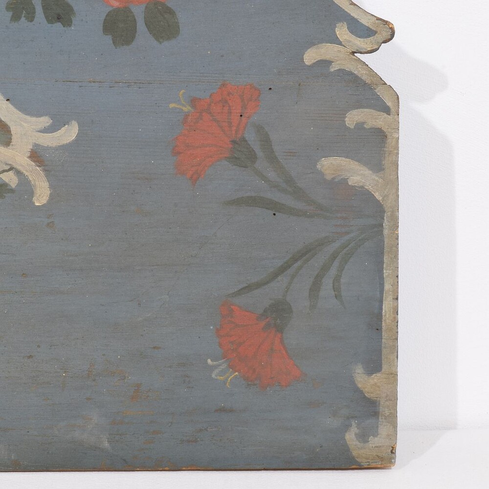 Very beautiful Folk Art wooden panel with a very rich decoration full of flowers and a Christ figure in the center