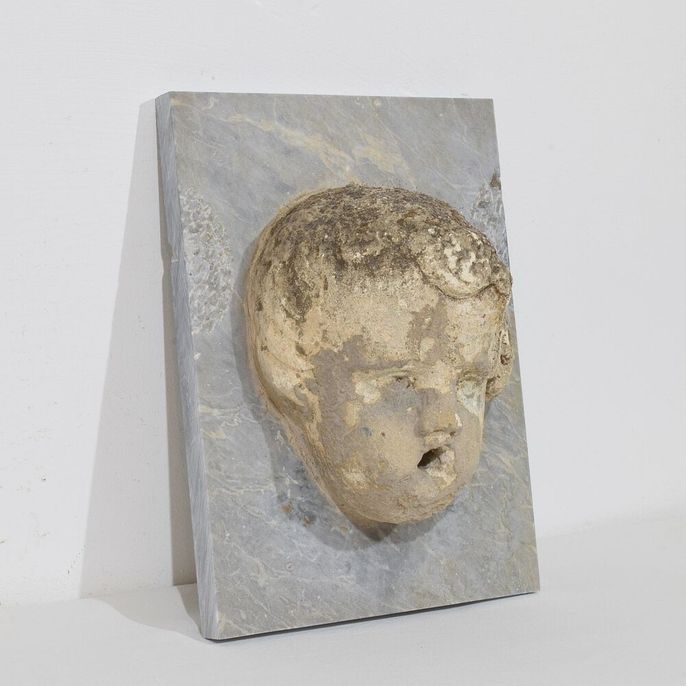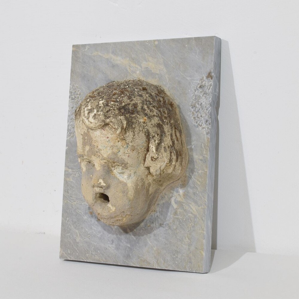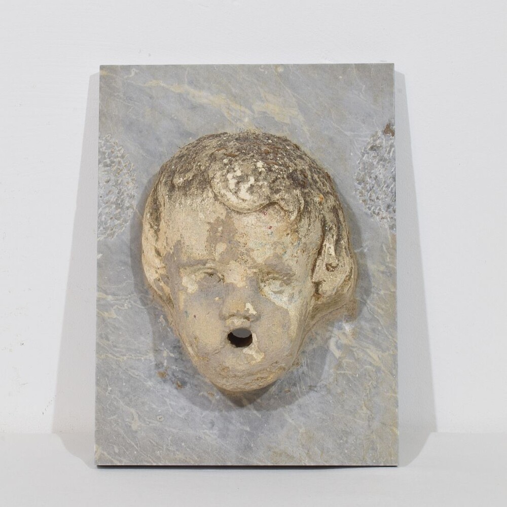 Italian 17th-18th Century Carved stone Cherub Fountain Head on Marble Panel