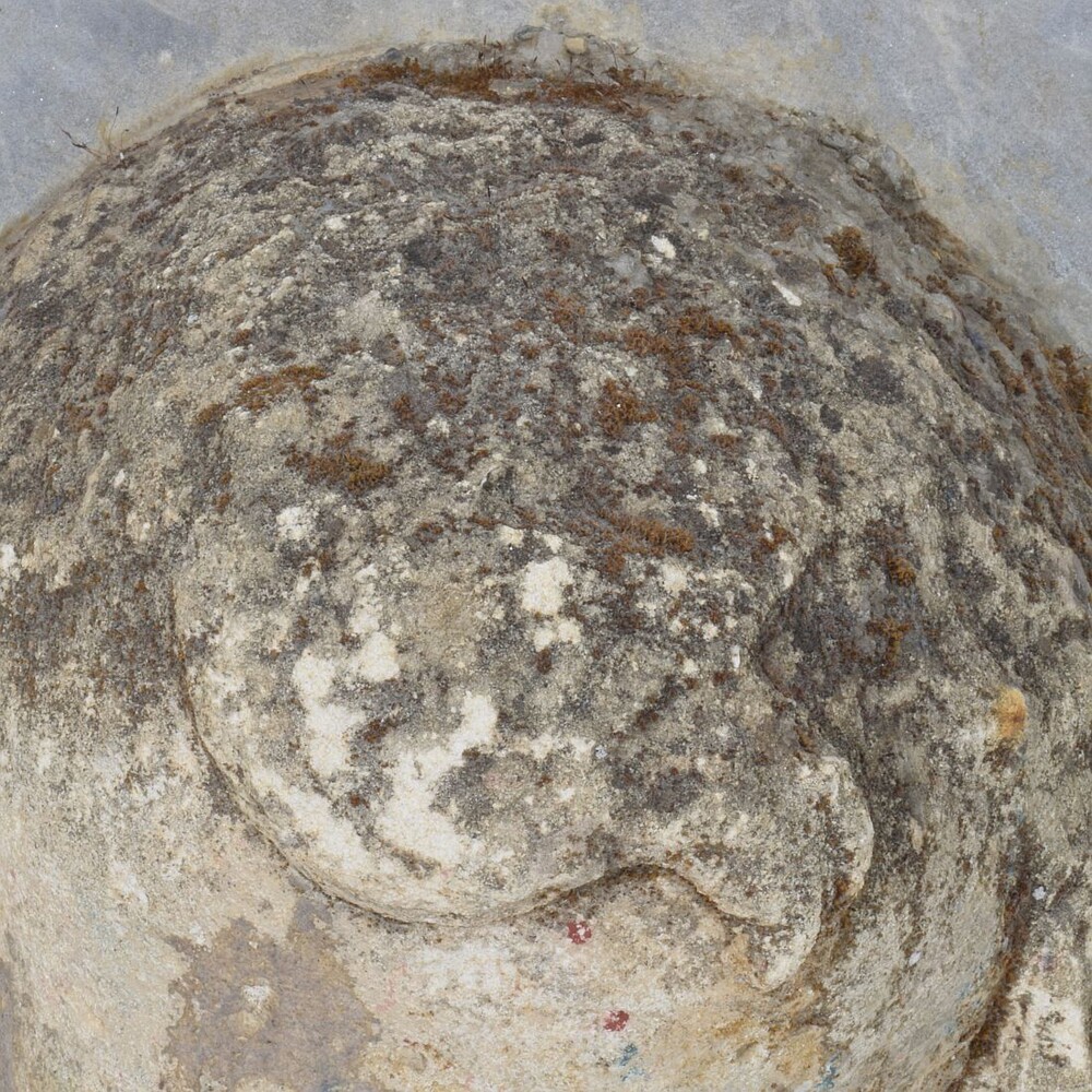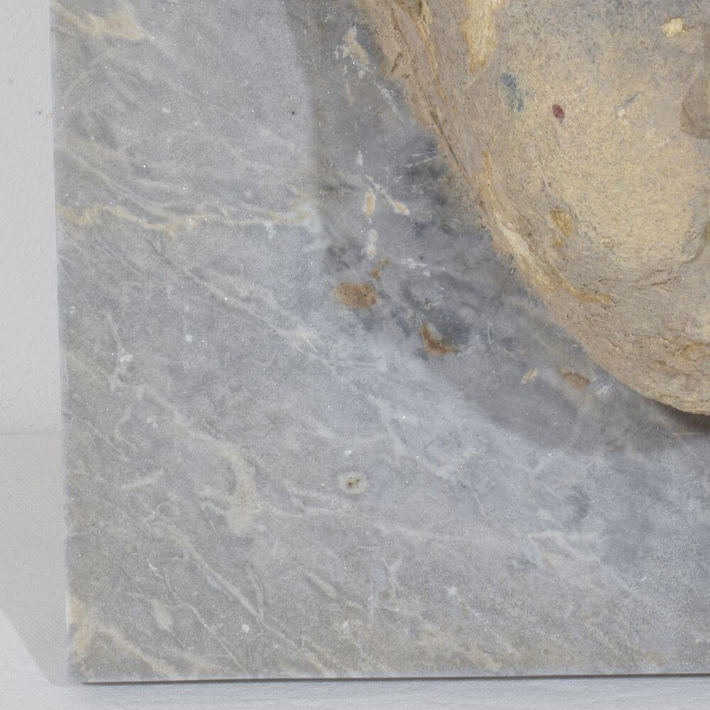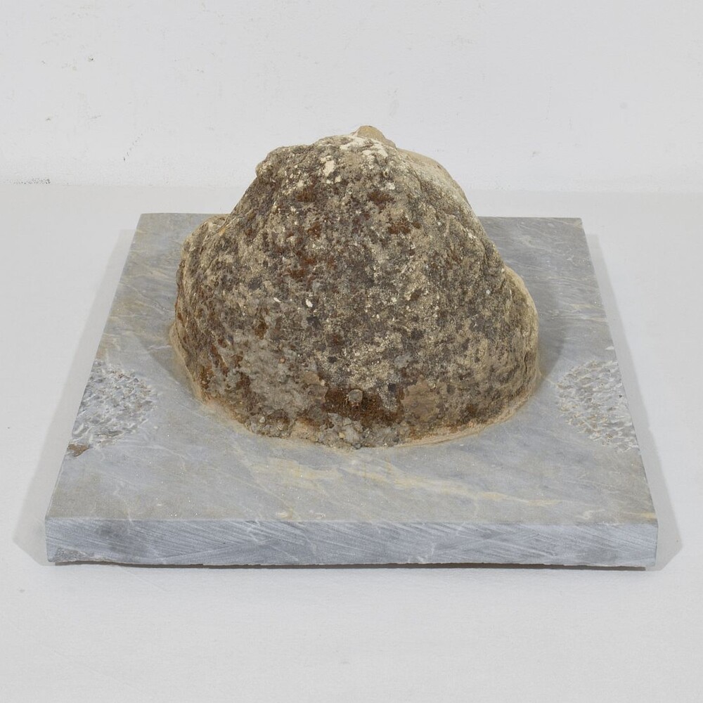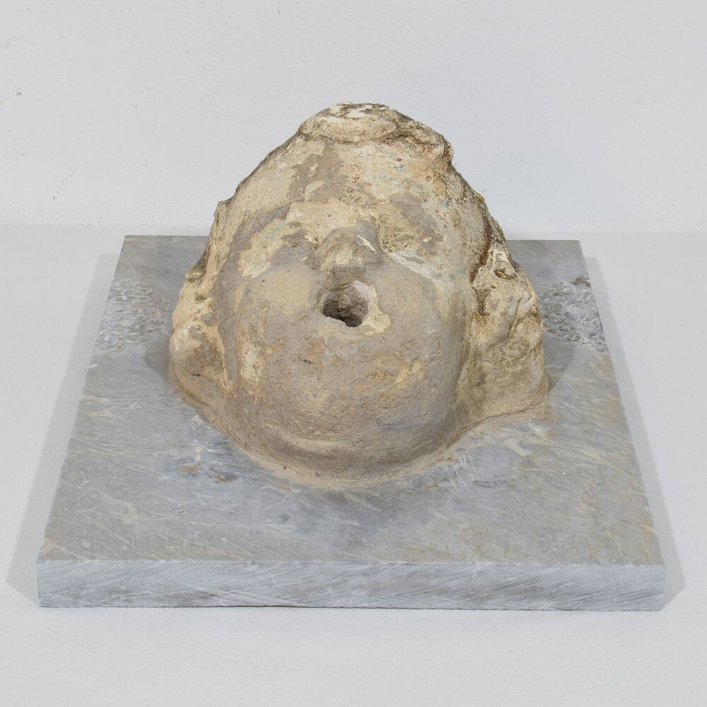 Spectacular and unique carved stone cherub fountain head on marble plate of later date.