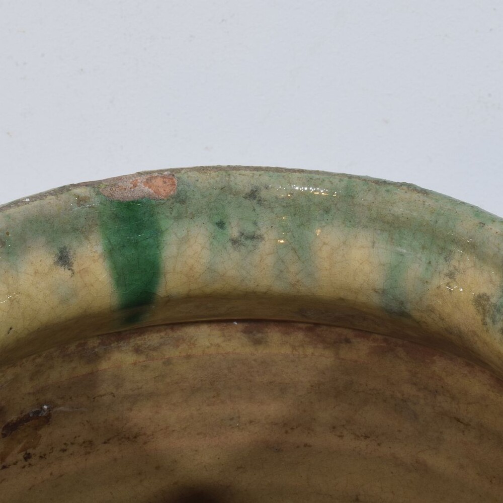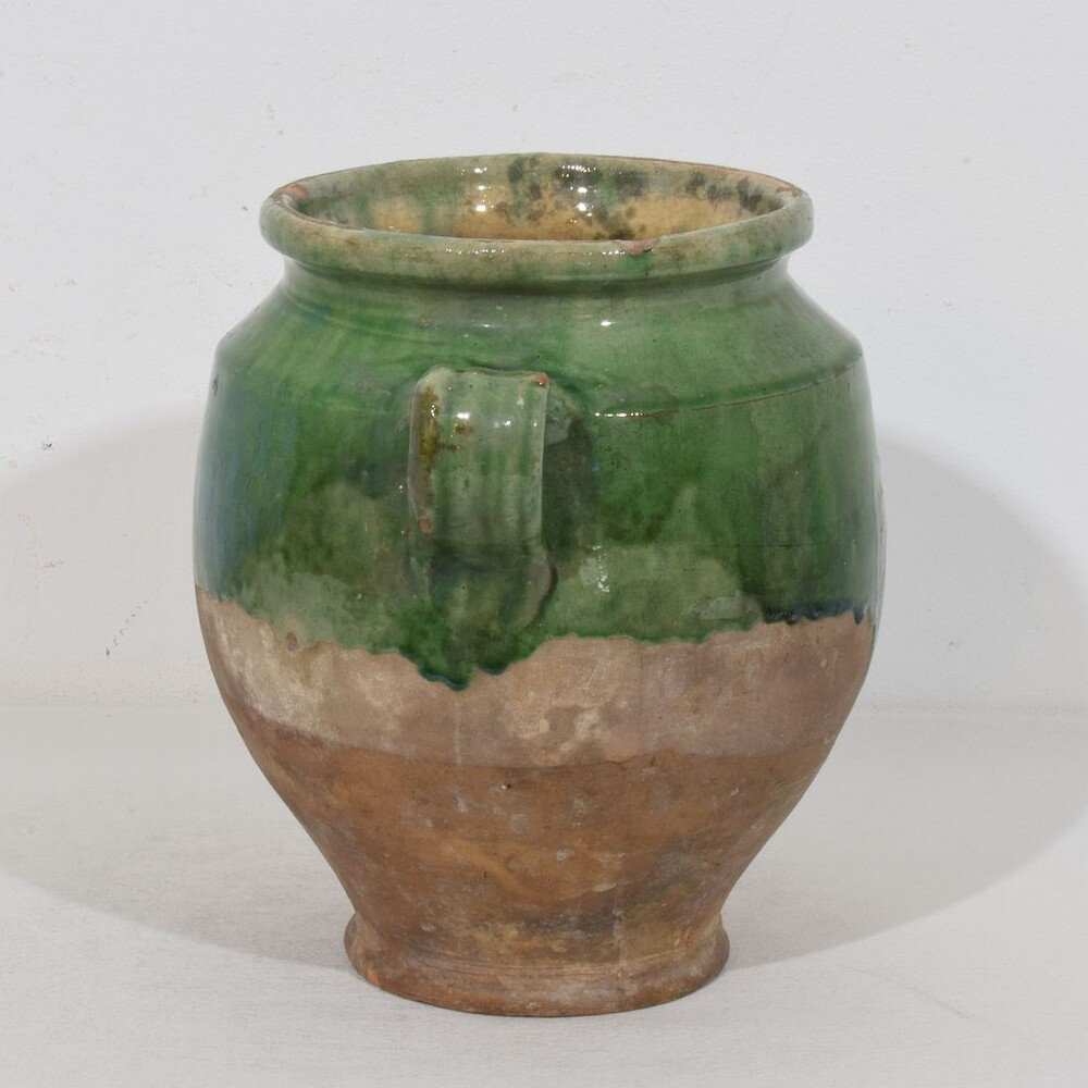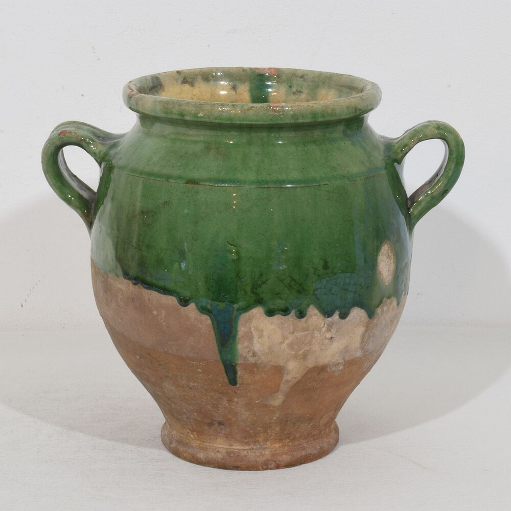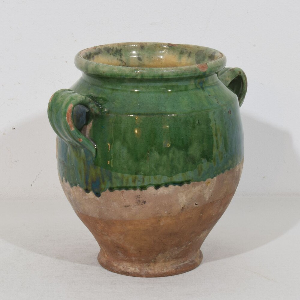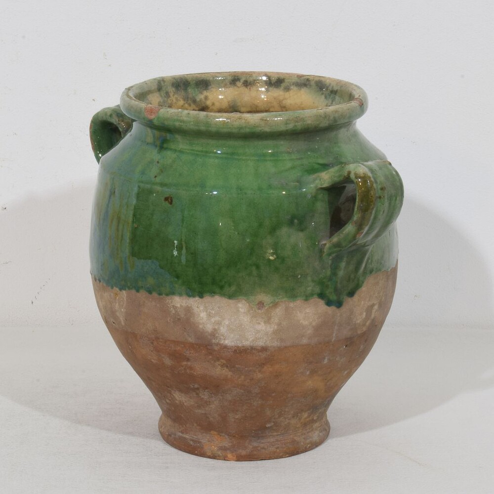 Beautiful weathered confit jar with a gorgeous green glaze. With green glaze they are extremely rare. Confit jars were used primarily in the South of France for the preservation of meats such as duck or goose for dishes such as cassoulet or foie gras. The bottom halves were left unglazed, due to the fact that the pots were half buried in the ground to keep the contents cooler and fresh.