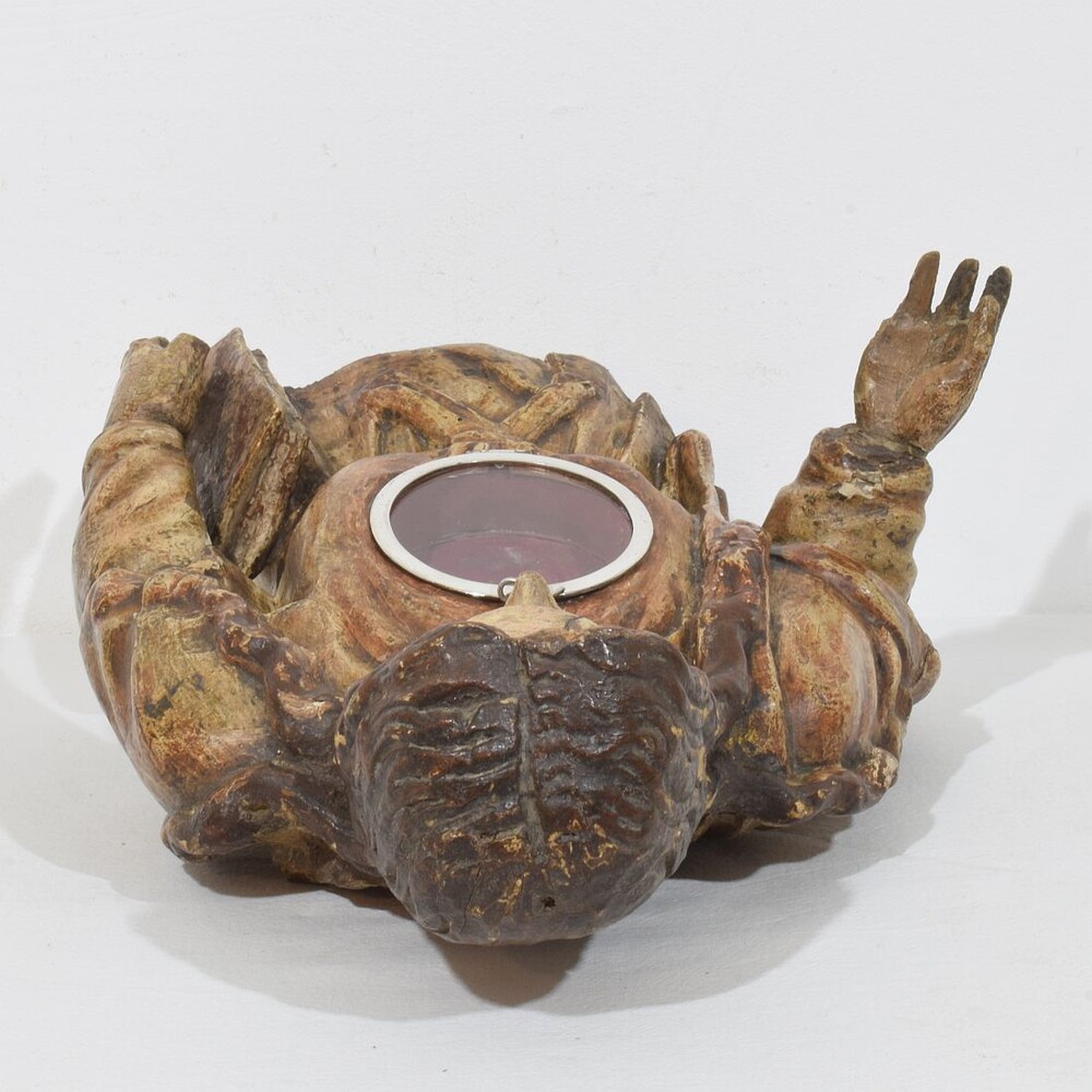 Spectacular and very decorative piece. Large carved wooden reliquary bust of a Madonna. Beautiful traces of color. Small losses and without the relics. Silver/silvered central piece to keep the relique is of later date , around 1850.