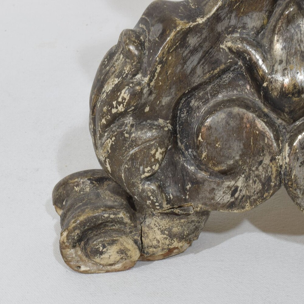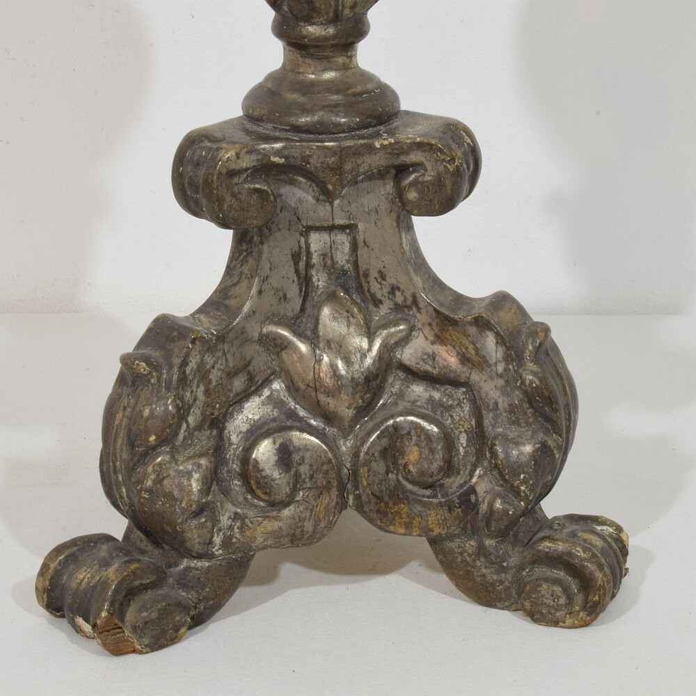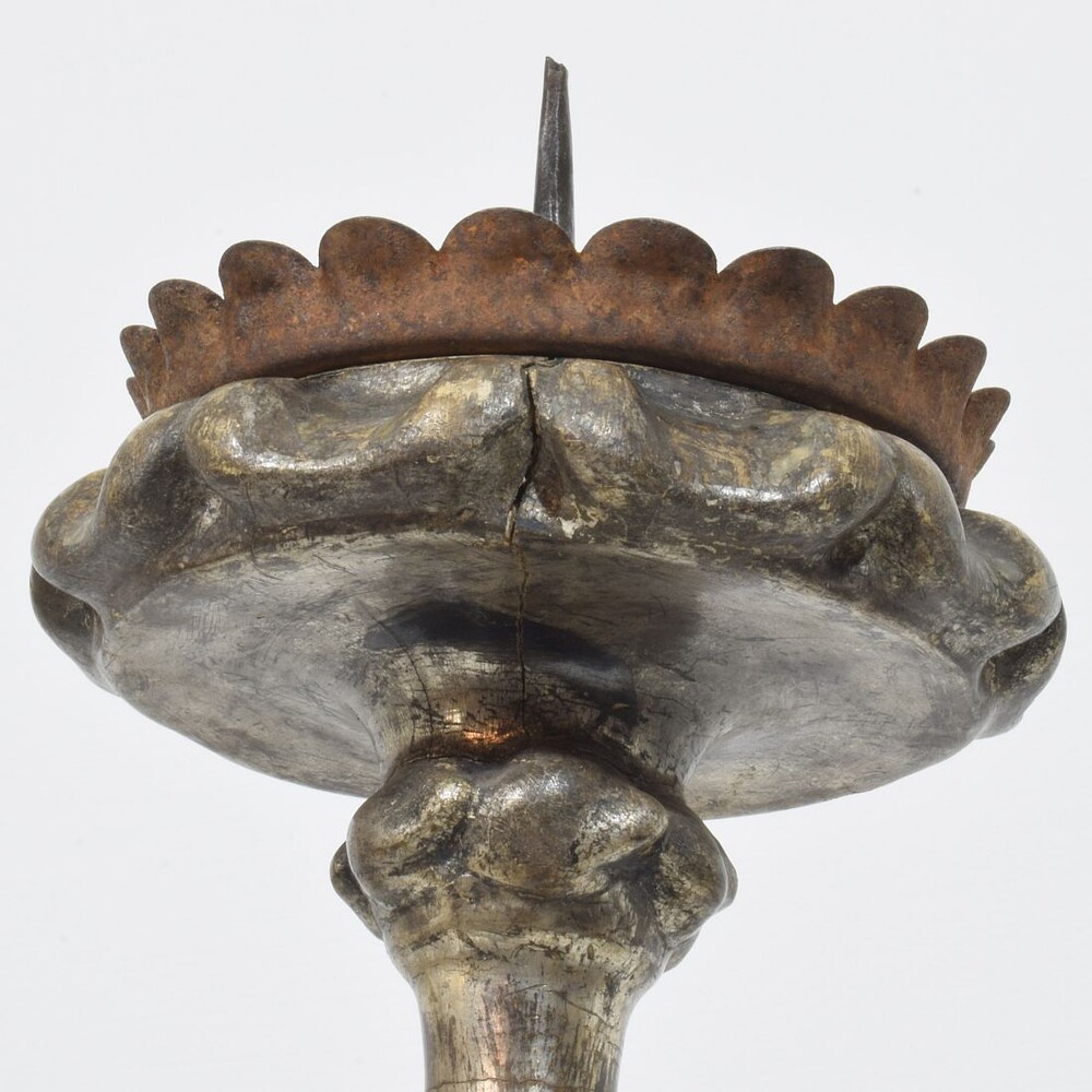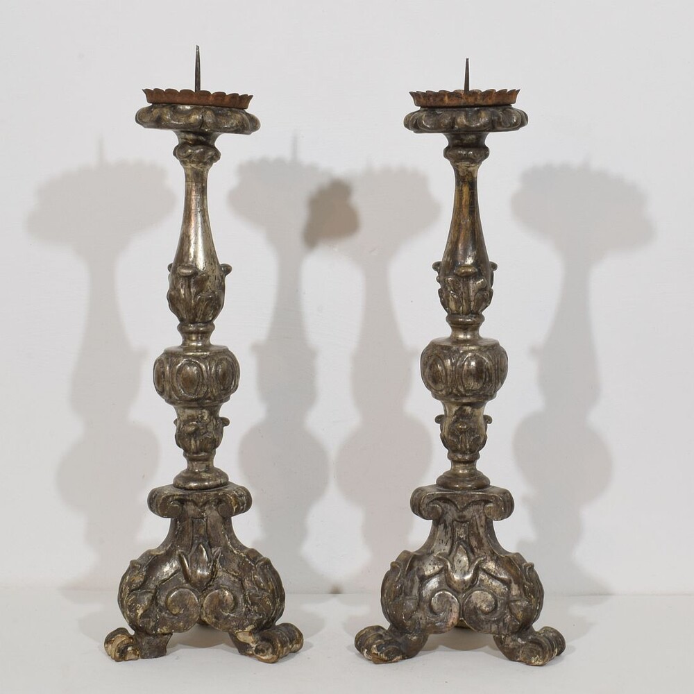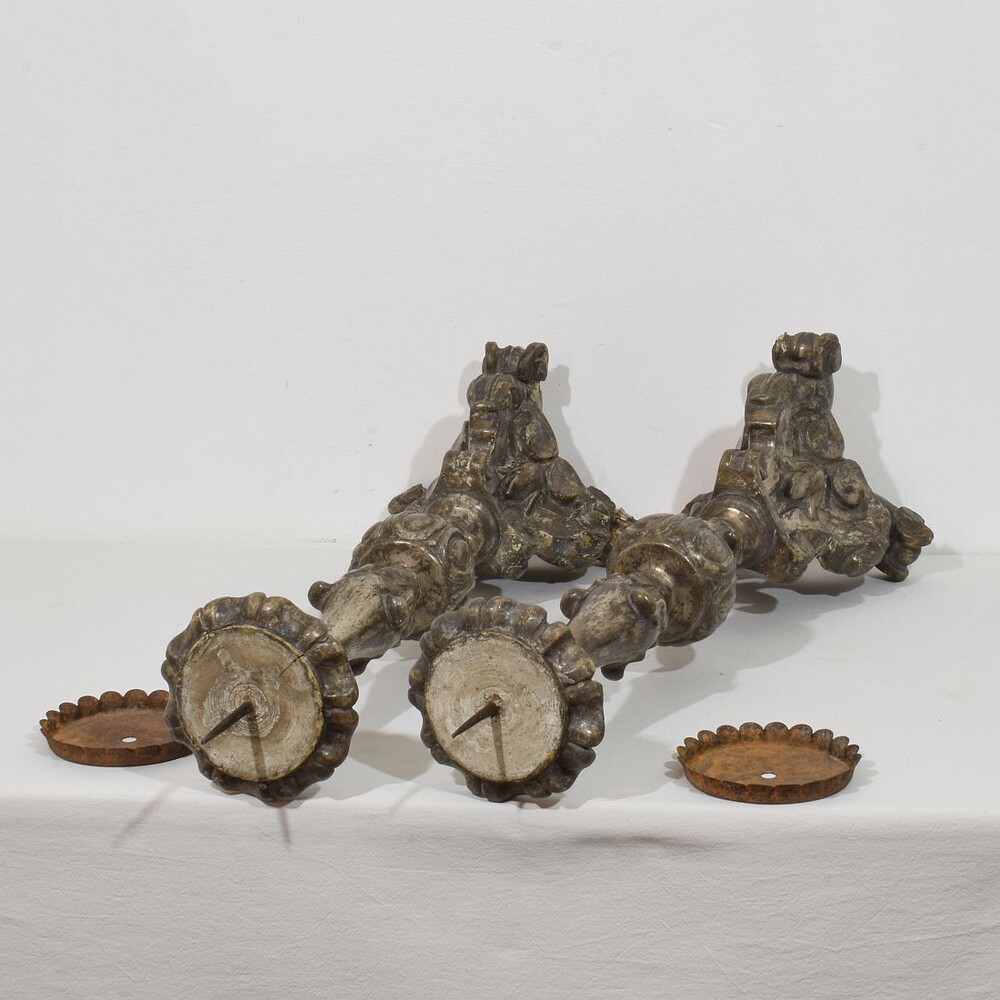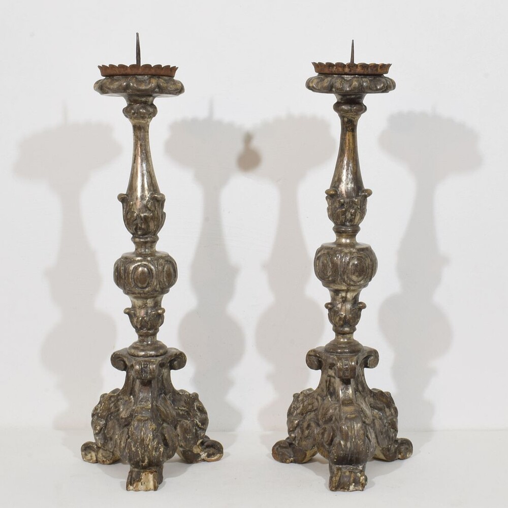 Great pair of carved wooden candleholders with their beautiful weathered silver leaf gilding.