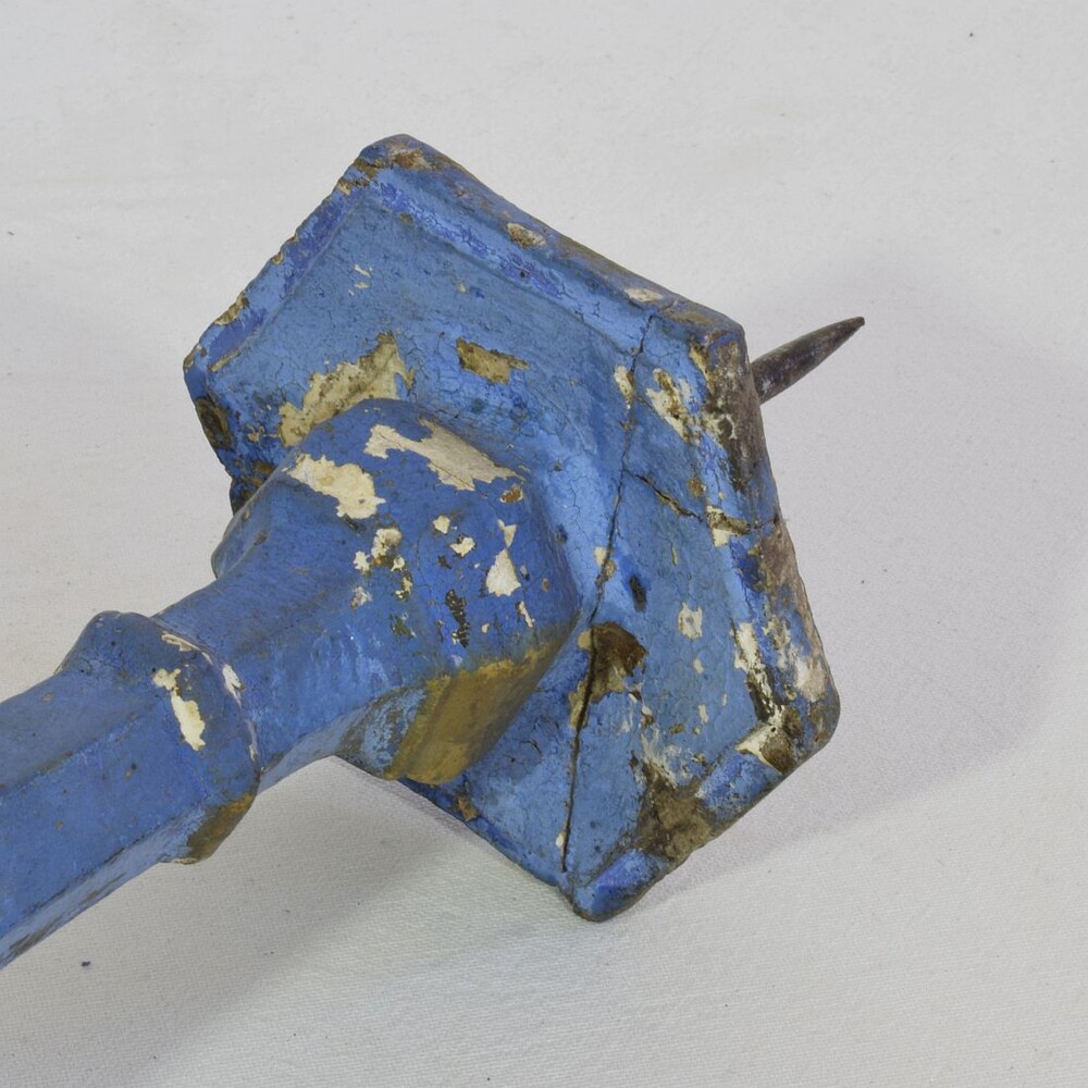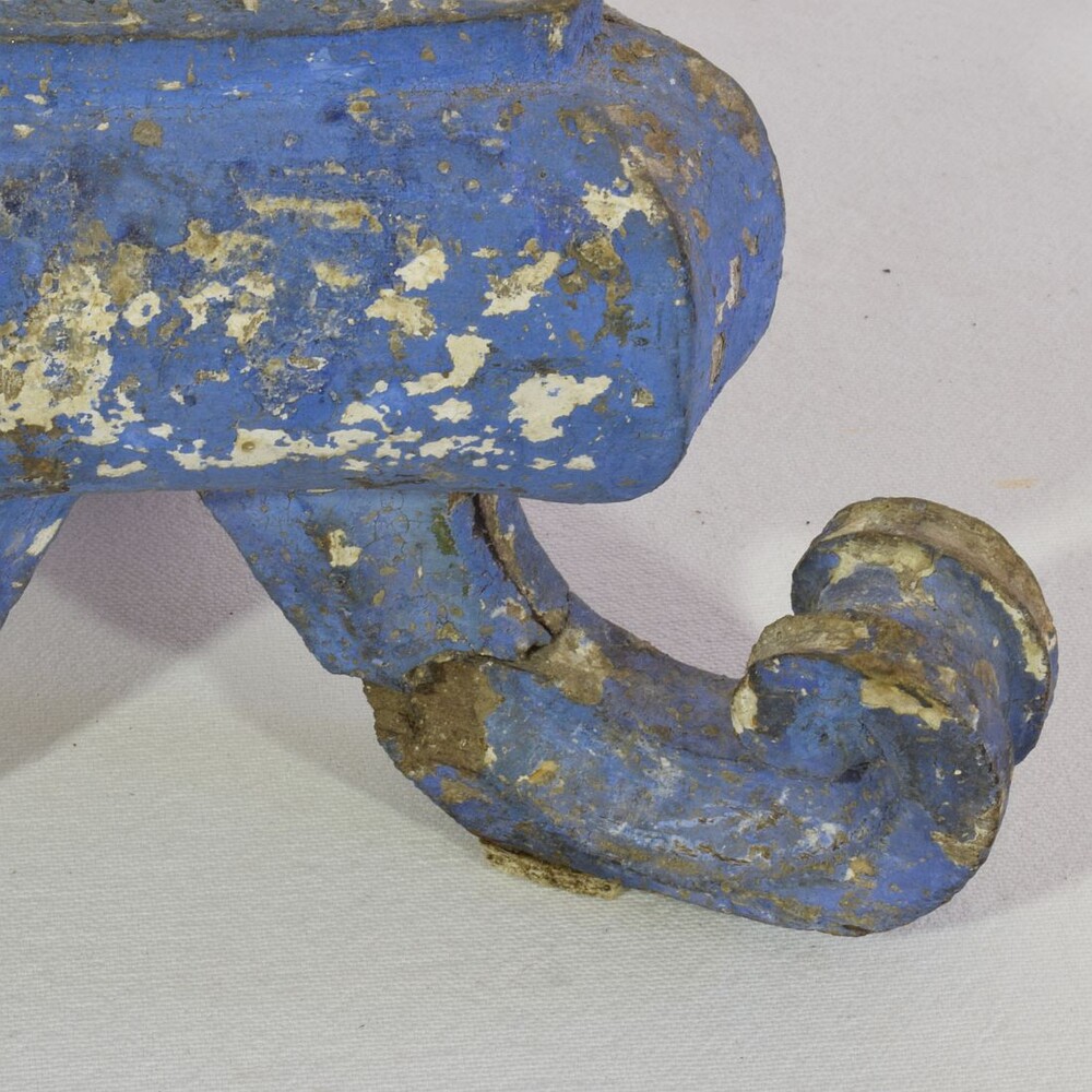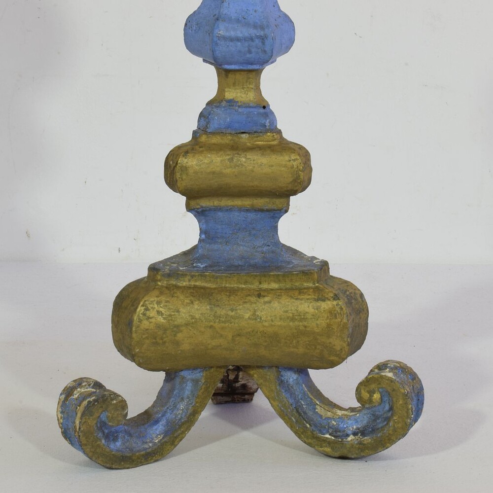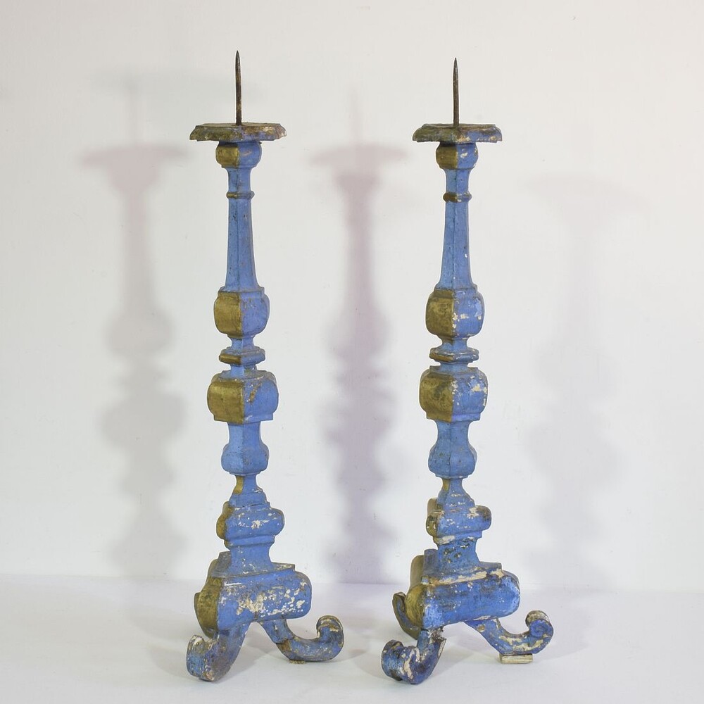 Great pair of baroque carved wooden candleholders with a stunning old color, Italy, circa 1750-1780. Weathered, repairs and losses. Measurement individual.for sale in Candleholders & Lighting | Tresors Trouves